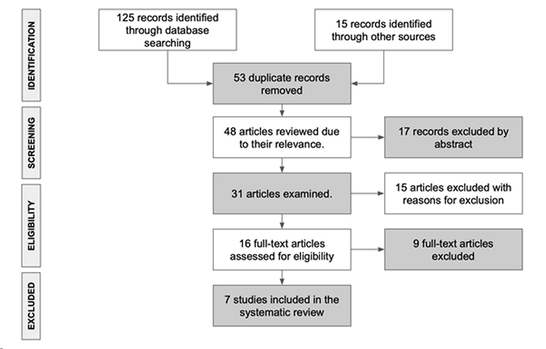 Two reviewers (JCFNA and AICR) independently screened the abstracts and selected the articles to assess the full-text articles (Table 1). Eligible studies were finalized by consensus among all authors. The results of this systematic review are reported following the recommendations established by Preferred Reporting Items for Systematic Reviews and Meta-Analyses (PRISMA). The PRISMA diagram was made for data selection, as shown in Figure 1.