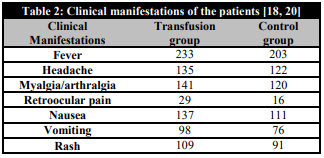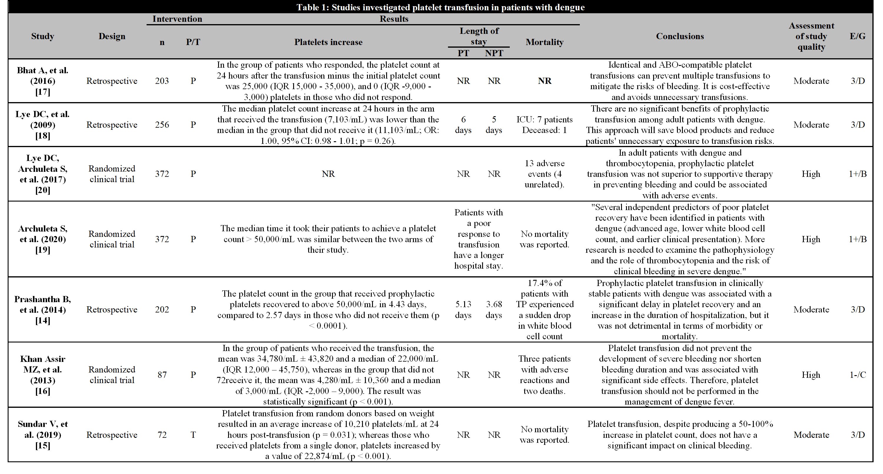 Conclusions: Prophylactic platelet transfusion is not recommended as a routine measure in patients with severe dengue and thrombocytopenia. The uncertainty highlights need to reach a specific consensus establishing the appropriate indications for platelet transfusion and what type of patients with dengue virus would be beneficial.