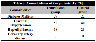 The population studied is divided into two groups: those patients who have received platelet transfusion and those who only received supportive treatment (restoration of plasma volume with crystalloids). Among the comorbidities found, essential hypertension, diabetes mellitus, and hyperlipidemia stand out. Fifty-two transfused patients had high blood pressure, while 40 non-transfused patients had high blood pressure. Twenty-nine patients who received platelet transfusion had diabetes, compared to 22 in the non-transfused group. Twenty-eight patients in each group had hyperlipidemia [18, 20]. It is worth mentioning that neither of the two selected studies included patients with ischemic disease (Table 3).