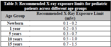 In clinical practice, the constant use of tools involving radioactive materials or ionizing radiation is a reality. X-rays are part of this complex group of tools. It is essential to recognize that exposure to ionizing radiation carries significant consequences, such as structural and molecular damage to biological tissues, which can lead to inherited defects or the induction of neoplasms. The magnitude of these adverse effects will depend on the time of exposure and the dose received [21, 22, 23]. In Table 3, we can see recommended x-ray exposure limits for pediatric patients across different age groups [24, 25].