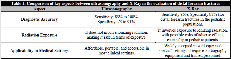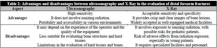The choice between ultrasonography and radiography in the evaluation of distal forearm fractures in children is a topic of great relevance in the field of diagnostic medicine. In this context, it is essential to address critical aspects that affect clinical decision-making, particularly regarding diagnostic accuracy, radiation exposure, and applicability in various medical settings (Table 1). The purpose of this analysis is to gain a deeper understanding of these two imaging modalities and their respective advantages and disadvantages (Table 2). We will explore how each of these techniques addresses clinical challenges and provides solutions in the context of distal forearm fractures, thus contributing to informed decision-making in medical practice.