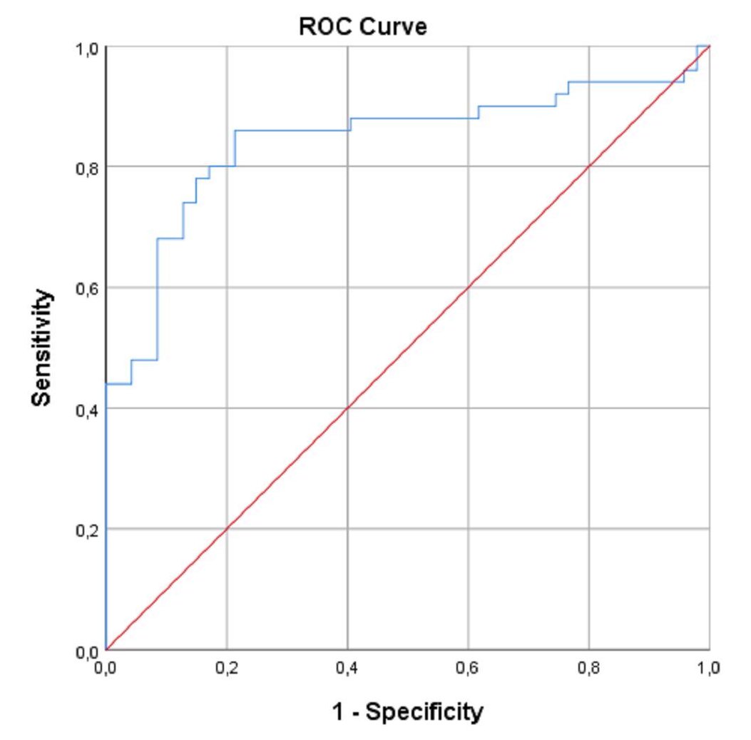 A total of 97 subjects were included in the study. Of the 97 subjects, 50 had type 2 diabetes-related DR, and 47 were apparently healthy. Demographic characteristics and blood test parameters of the patients are presented in Table 1. Of 50 diabetic patients, 18 were men (36%), and 32 were women (64%). Of 47 healthy control subjects, 22 were male (46.8%) and 25 were female (53.2%). The mean ages were 62.38±8.69 and 59.34±7.22 years for the diabetic and control groups, respectively. There was not a significant difference among the groups in terms of sex (p=0.2) or age (p=0.06). Mean serum HMGB-1 levels were 24.99 (4-181) and 12.60 (3-27) pg/mL in the DR group and control group, respectively. There was a significant difference among the groups in terms of HMGB-1 levels (p<0.001). A comparison of serum HMGB-1 levels between patients and the control group is presented in Table-2. In the Spearman correlation analysis between blood glucose and HMGB-1 levels in the DR group, there was a positive correlation between blood glucose and HMGB-1 (Spearman's rho (ρ)=0.07). Similarly, there was a positive correlation between HbA1c and HMGB-1 levels (Spearman's rho (ρ)=0.06). As a result, it was determined that HMGB-1 levels increased as blood glucose and HbA1c levels increased. The correlation between HMGB-1 values and clinical data in DR patients is presented in Table 3. In the ROC analysis of serum HMGB-1 levels in the DR and control groups, a cut-off value was determined. Accordingly, the cut-off value was found to be 18.25 pg / mL (Figure 1).