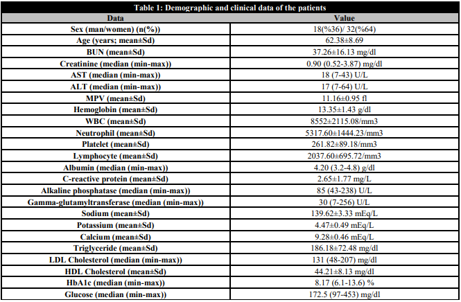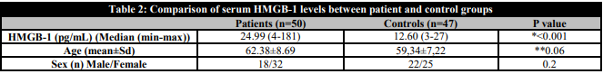 Material and methods: This study was carried out in the internal medicine and ophthalmology departments of the Gaziantep Medicalpark Hospital. The records of 50 patients diagnosed with type 2 diabetes mellitus with diabetic retinopathy and 47 healthy subjects who applied to our clinic between January 2016 and December 2018 were retrospectively scanned. Five cc of venous blood was taken from the patients, and control groups were included in the study for routine laboratory tests and serum HMGB-1 levels to be studied under appropriate conditions. Human HMGB-1 levels were measured using the ELISA method.