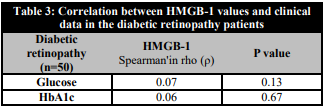 Results: There was a significant difference among the groups in terms of HMGB-1 levels (p<0.001) (Table-1). There was a positive correlation between blood glucose and HMGB-1 in the diabetic retinopathy group (Spearman's rho (ρ)=0.07). Similarly, there was a positive correlation between HbA1c and HMGB-1 levels in the diabetic retinopathy group. (Spearman's rho (ρ)=0.06).