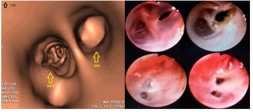 (a); Translucent membranes occluding subsegments (left images) were disrupted by electrocautery aplied by fiberbronchoscope (right images) allowing clinical improvement (b).