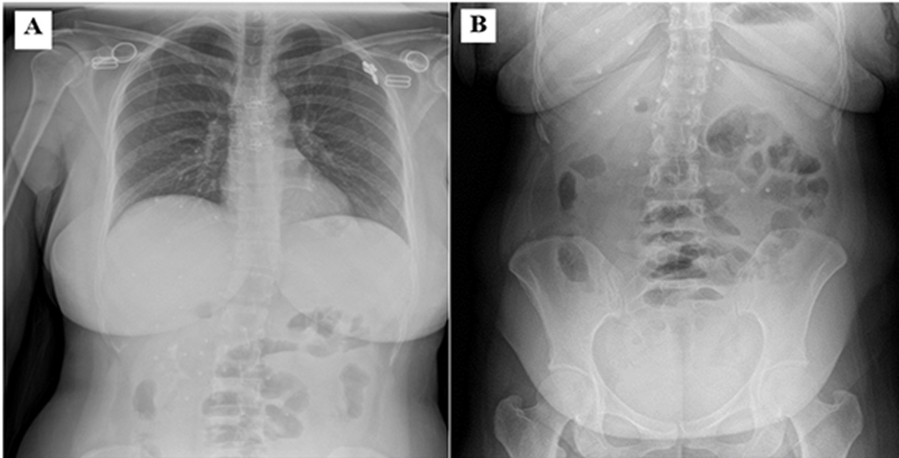 A 36-year-old woman from Bangladesh came to A&E because of central abdominal pain for several hours. She was also suffering from nausea and vomiting but was not constipated as she had gone to the toilet the day before. She had never had surgery and had no known previous medical problems. She stated that she did not have a persistent cough and had not been in contact with anyone who had tuberculosis. On examination, she looked ill and dehydrated. Her blood pressure was 140/86 mm of mercury, her pulse was 94 beats per minute and her oxygen saturation was 99% on room air. Her abdomen was noticeably tender in the periumbilical area and slightly distended. Bowel sounds were slow. A leukocytosis of 17.6x103 was the only abnormality noted on blood tests. A chest radiograph showed no free air under the diaphragm, abdominal radiograph showed dilated loops of small bowel without multiple fluid levels [Figure 1].