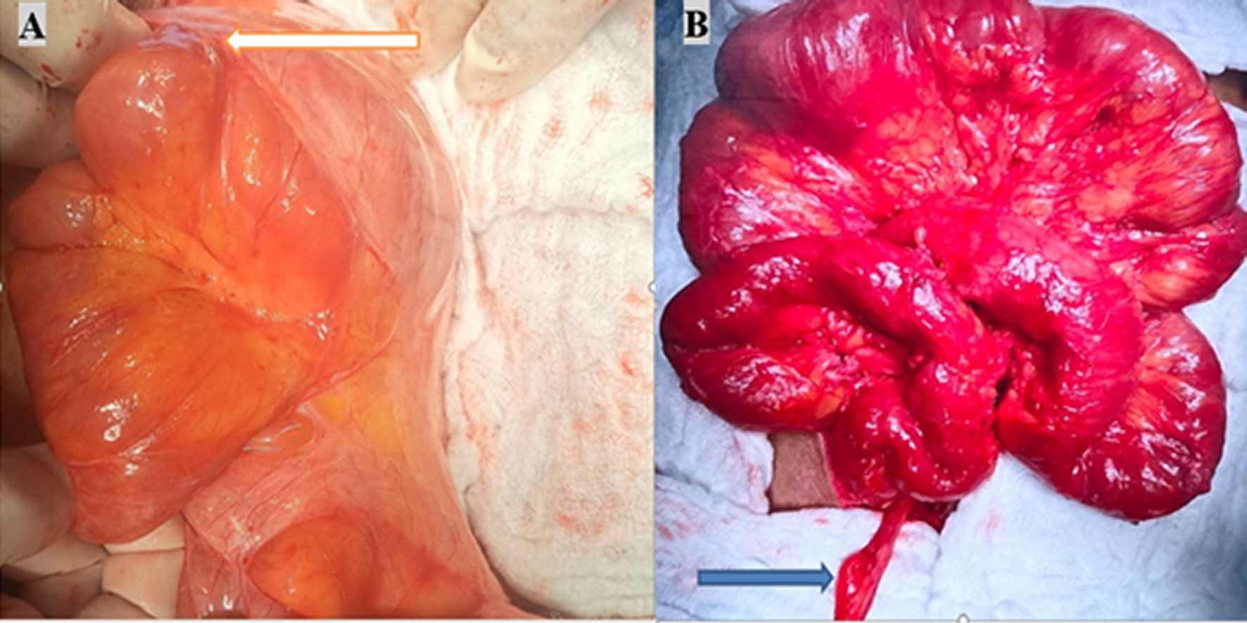Following initial fluid resuscitation, an urgent exploratory laparotomy was performed on the patient. During surgery, a fibrous membrane was discovered to surround the entire small bowel, apart from 100 cm of the proximal jejunum. The membrane was divided and the small bowel adhesions were carefully released using a combination of blunt and sharp dissection without resection of the bowel (Figure 3).