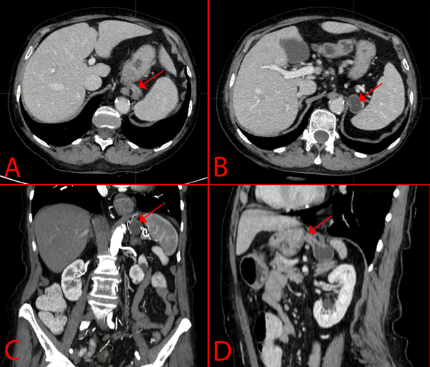 A: Axial section, venous phase (arrow indicates the neck of the diverticulum); B: Axial section, venous phase (arrow indicates the fundus of the diverticulum); C: Frontal section (arterial phase) demonstrating the fundus of the diverticulum located in a highly vascularized zone; D: Sagittal section, venous phase (arrow indicates the neck of the diverticulum).