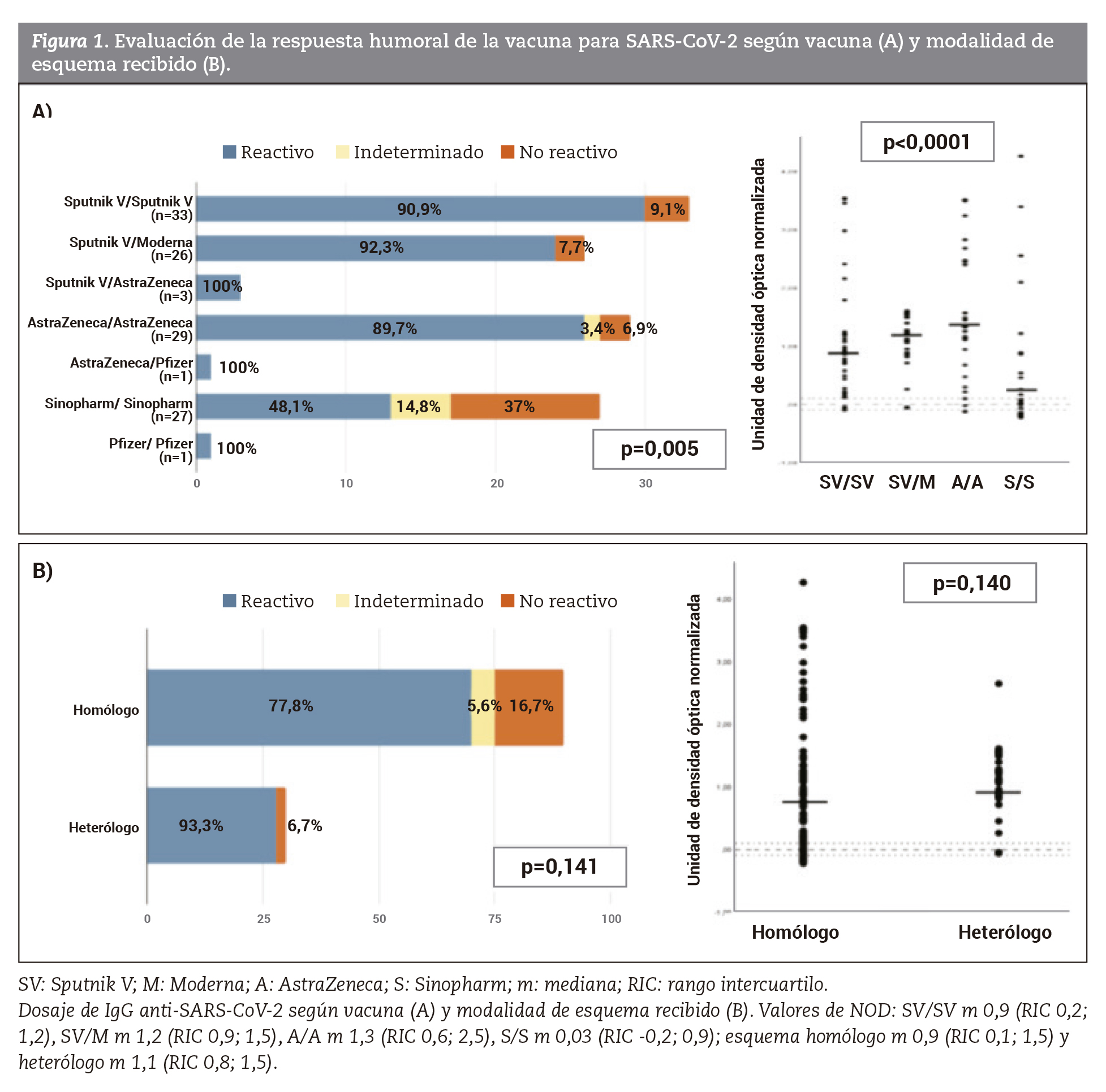 El uso de la vacuna Sinopharm se asoció a una respuesta no reactiva o indeterminada. De los 27 pacientes que recibieron este esquema, solo el 48,1% alcanzó anticuerpos detectables luego de la segunda dosis, 14,8% tuvo una prueba indeterminada y 37% no reactiva (p=0,005). Además, los valores de NOD fueron estadísticamente más bajos en este grupo (. 0,03, RIC -0,2; 0,9, p<0,0001) (Figura 1A). Si bien los pacientes con esquemas heterólogos tuvieron mayor frecuencia de anticuerpos detectables en comparación con aquellos con homólogos, esta diferencia no alcanzó significancia estadística (93,8% vs 77,8%, p=0,141) (Figura 1B). El 85,7% (6/7) de los pacientes que había tenido infección por SARS-CoV-2 previo a la vacunación, presentó una prueba reactiva luego de la primera dosis, y en el caso del paciente restante la misma fue indeterminada. Pero luego de la segunda, todos tuvieron anticuerpos detectables. (Tabla 2). El valor de NOD también fue mayor en este grupo, aunque la diferencia no alcanzó significancia estadística (. 1,3, RIC 1,1; 1,6 vs m 0,9, RIC 0,2; 1,5, p=0,119). No se encontró asociación entre el resultado y las características sociodemográficas y la presencia de comorbilidades.
