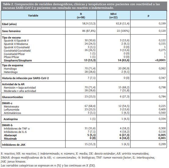 Results: a total of 120 patients with RA were included. A quarter was receiving glucocorticoids, 50.9% biological drugs and 13.3% JAK inhibitors (janus kinases). Only 6% had a history SARS-CoV-2 infection. The most used vaccine was Sputnik V (52.9%) and 25% received mixed regimens. After the first dose, 59% had a non-reactive or indeterminate test, and after the second, 18% were still having this result. The application of homologous Sinopharm vaccine regimen (63.6% vs 13.3%, p<0.0001) and the use of abatacept (27.3% vs 5.1%, p=0.005) and rituximab (18.2% vs 0%, p=0.001) at vaccination was associated with a non-reactive or indeterminate result.