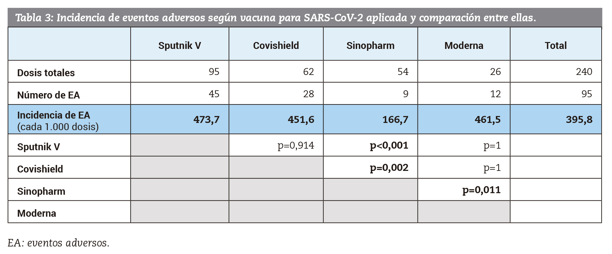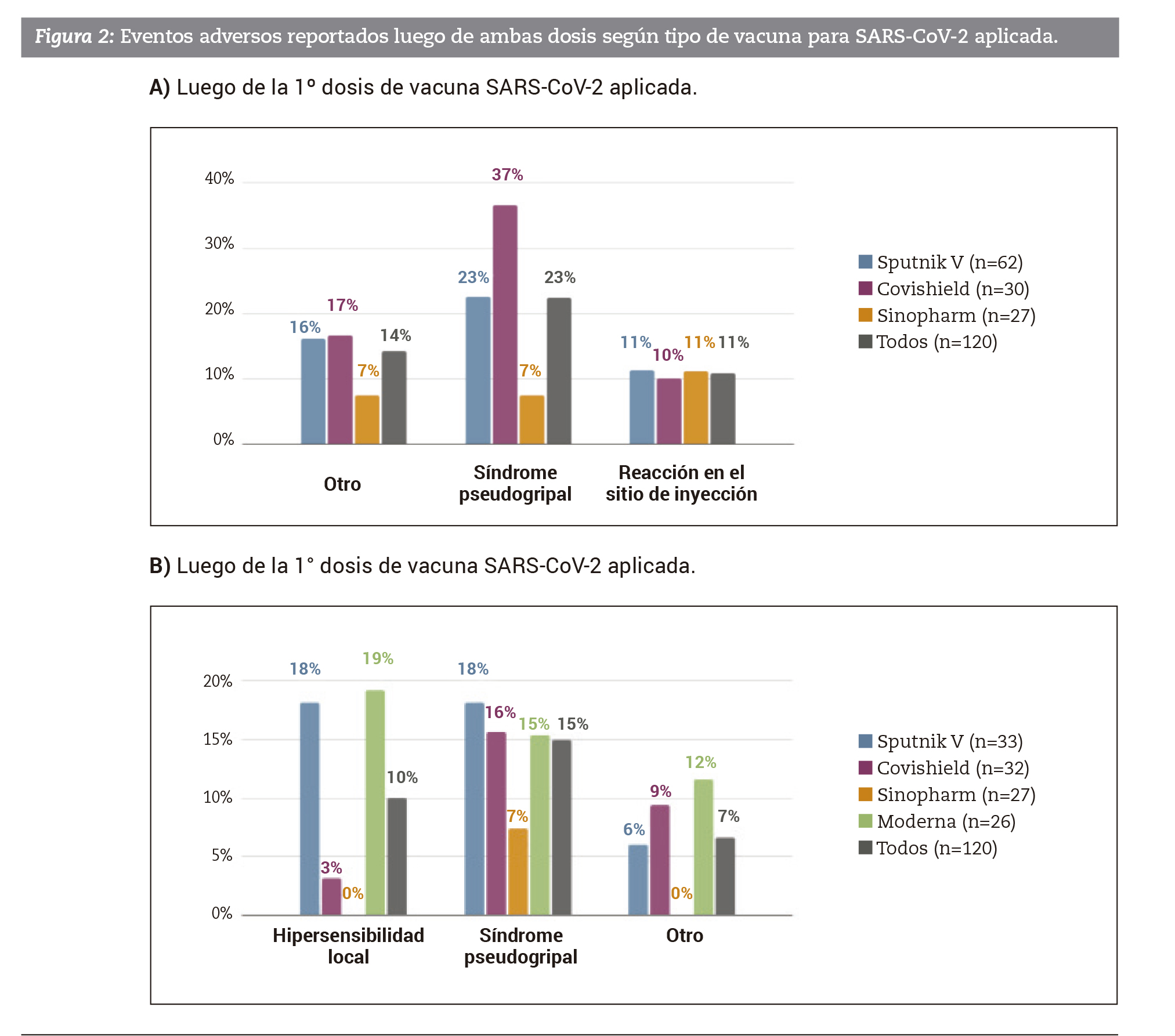 El 43% de los pacientes reportó al menos un evento adverso (EA) luego de la primera dosis y 28% luego de la segunda. Los más frecuentes fueron las reacciones en el sitio de inyección y el síndrome pseudogripal (Figura 2A y Figura 2B). Todos fueron leves/moderados y no requirieron hospitalización. La incidencia total de EA fue de 395,8 eventos cada 1.000 dosis aplicadas. La misma fue significativamente menor con el uso de la vacuna Sinopharm, 166,7 eventos cada 1.000 dosis aplicadas, en comparación con las otras vacunas: Sputnik V 473,7 eventos cada 1.000 dosis, Covishield 451,6 eventos cada 1.000 dosis y Moderna 461,5 eventos cada 1.000 dosis (p<0,002 en todos los casos) (Tabla 3).