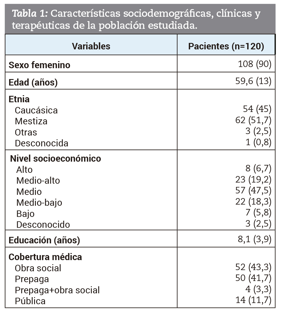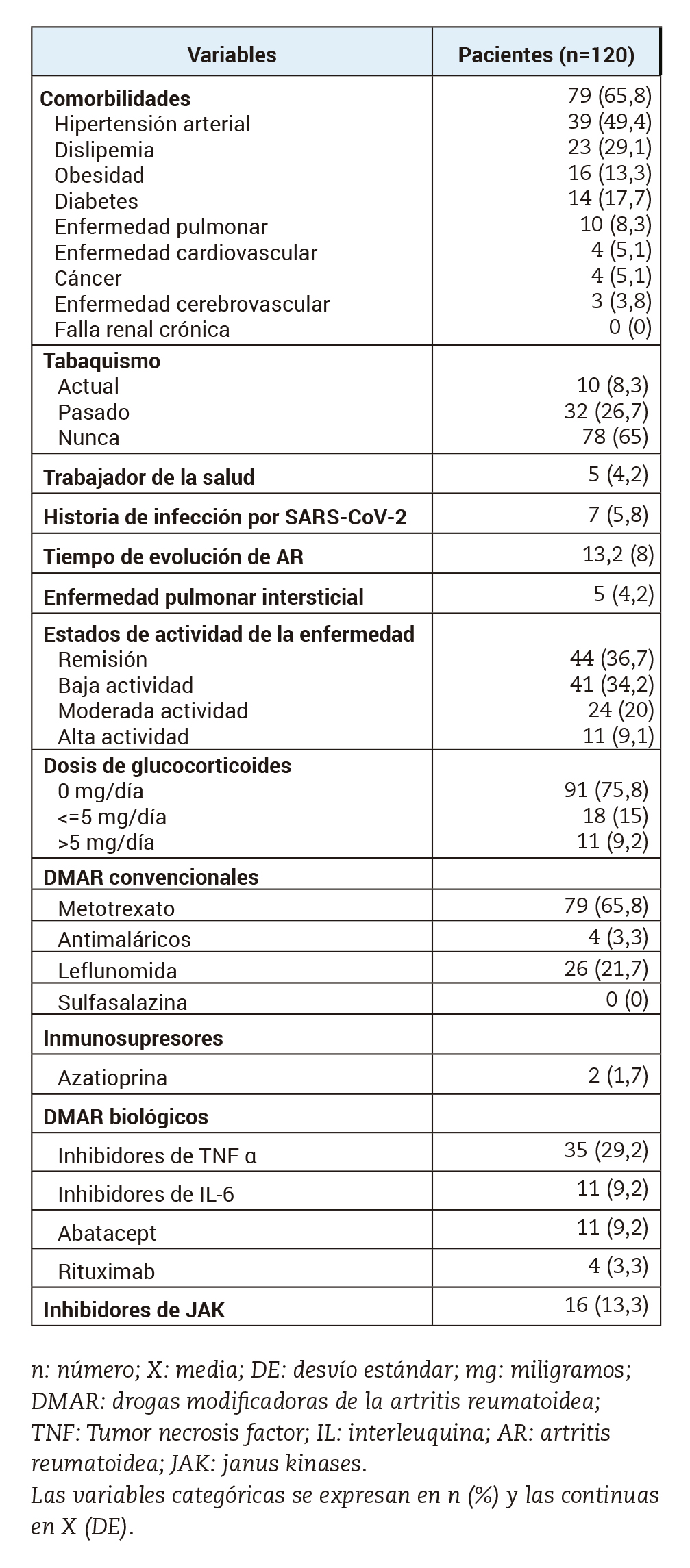 Se incluyó un total de 120 pacientes con AR. Se obtuvieron muestras de 100 personas luego de la primera dosis y de 120 luego de la segunda. La mayoría (90%) fue de sexo femenino, con una edad media de 59,6±13 años, y de etnia mestiza o caucásica, de nivel socioeconómico medio y con cobertura de salud, ya sea obra social o prepaga. El 65% reportó al menos una comorbilidad, y siete (5,8%) de ellos habían tenido infección por SARS-CoV-2 previamente entre 1 y 6,5 meses antes de la primera dosis. El tiempo promedio de evolución de la AR fue de 13,2±8 años. La mayoría se encontraba en remisión y baja actividad de la enfermedad al momento de la vacunación. Con respecto al tratamiento, 25% usaba glucocorticoides, 50,9% agentes biológicos y 13,3% inhibidores de JAK (janus kinases) (Tabla 1).