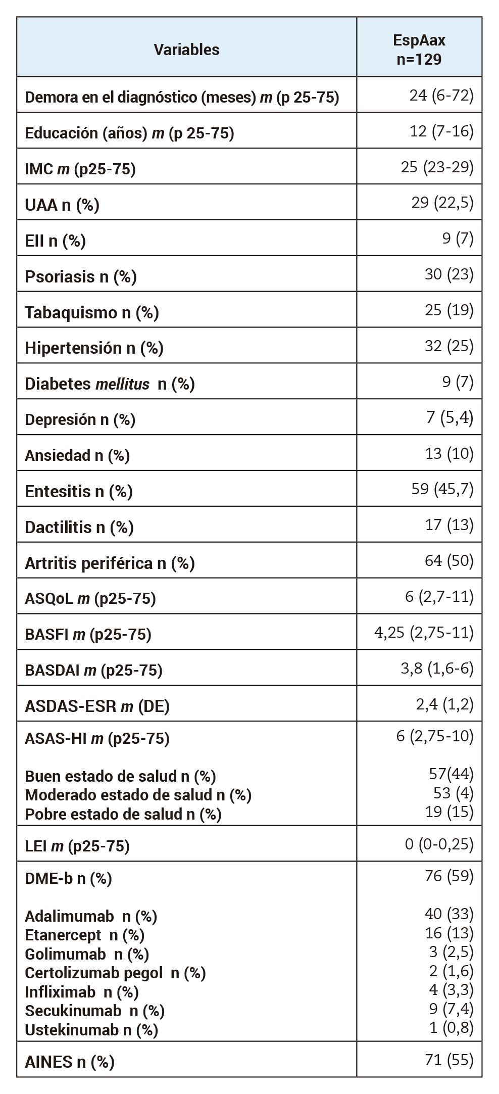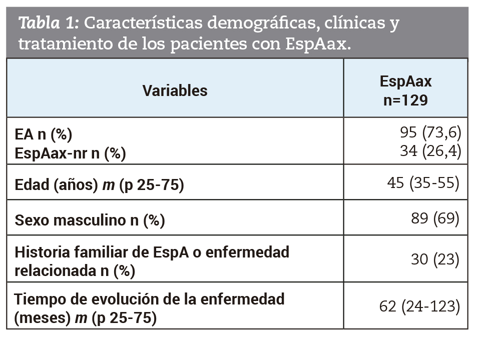 Se incluyeron 129 pacientes, 95 (73,6%) con EA y 34 (26,4%) con EspAax-nr, con una edad mediana de 45 (35-55) años. La mediana del tiempo de evolución de la enfermedad fue de 62 (24-123) meses y de la demora en el diagnóstico de 24 (6-2) meses. Las características demográficas, clínicas y terapéuticas de la población en estudio se muestran en la Tabla 1.