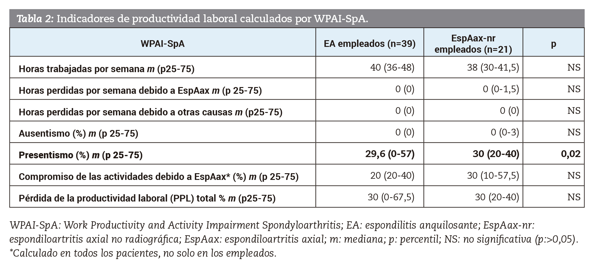 En este estudio, 60 (46,5%) de los pacientes estaban empleados (Tabla 2). La mediana de presentismo de los pacientes con EA fue del 26,6% (0-57) y del 30% (20-40) para aquellos con EspAax-nr, siendo esta diferencia estadísticamente significativa (p=0,02). Asimismo, la mediana de PPL fue del 30% en ambos grupos de pacientes.