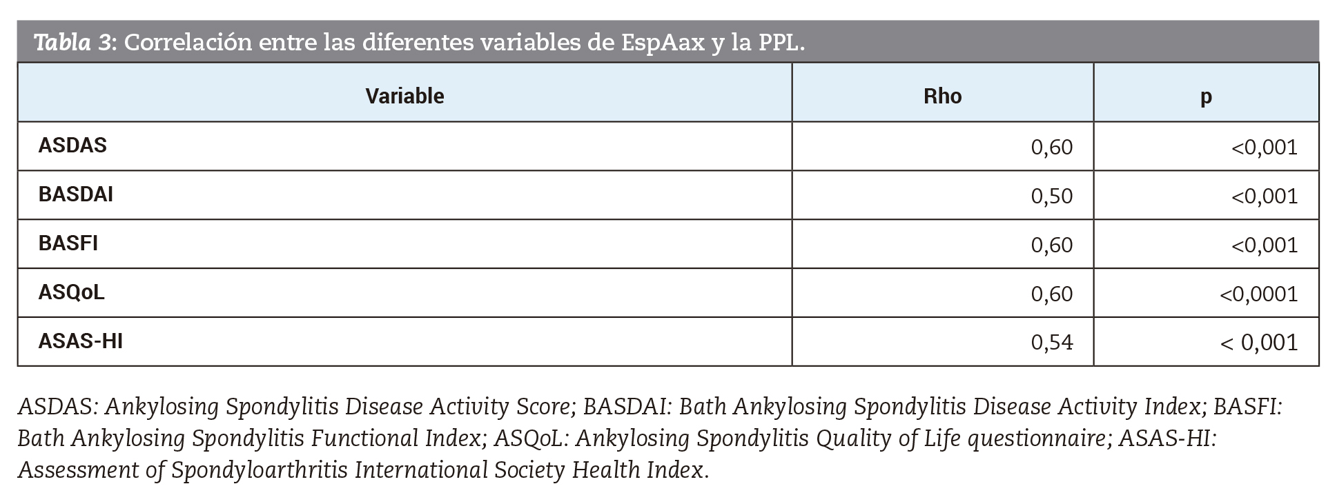 La PPL correlacionó positivamente con medidas de actividad de la enfermedad, capacidad funcional, calidad de vida y estado de salud en pacientes con EspAax (Tabla 3).