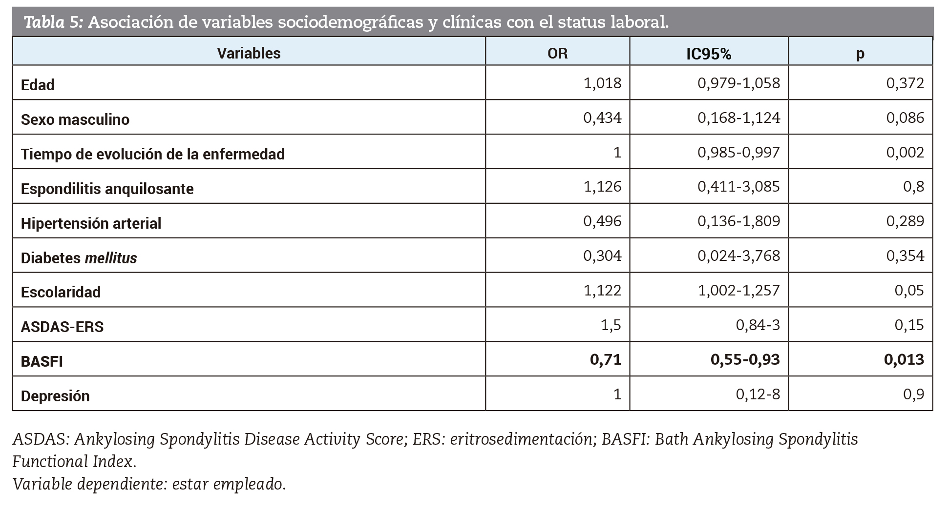 Finalmente, al realizar el análisis de regresión logística, se halló que una mejor capacidad funcional evaluada por BASFI se asoció en forma independiente a estar empleado (Tabla 5).