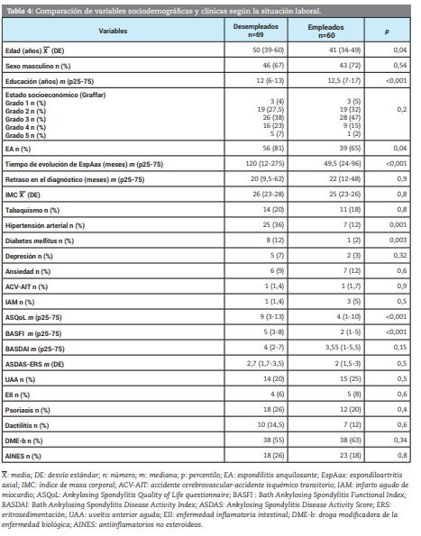 Resultados: se incluyeron 129 pacientes con EspAax, 95 (73,6 %) con EA y 34 (26,4%) con EspAax-nr. La mediana (p25-75) de edad fue de 45 (35-55) años. La duración mediana de la enfermedad fue de 62 (24-123) meses y el retraso en el diagnóstico fue de 24 (6-72) meses. Sesenta (46,5%) pacientes estaban empleados. La mediana (p25-75) de presentismo de los pacientes con EA fue del 29,6% (0-57) y del 30% (20-40) para los pacientes con EspAax-nr (p=0,02). Asimismo, la mediana (p25-75) de PPL fue del 30% en ambos grupos de pacientes. Se encontró una correlación positiva entre la PPL y las siguientes variables: ASDAS (Rho:0.60), BASDAI (Rho:0.50), BASFI (Rho:0.60), ASQoL (Rho:0.60) y ASAS health index (Rho:0.54). En el análisis bivariado, los factores asociados al desempleo fueron el diagnóstico de EA, la edad avanzada, la mayor duración de la enfermedad, las comorbilidades (hipertensión y diabetes), el menor número de años de educación, la peor calidad de vida y la menor capacidad funcional. En el análisis multivariado, una mejor función física (evaluada por BASFI) se asoció de forma independiente a estar empleado.