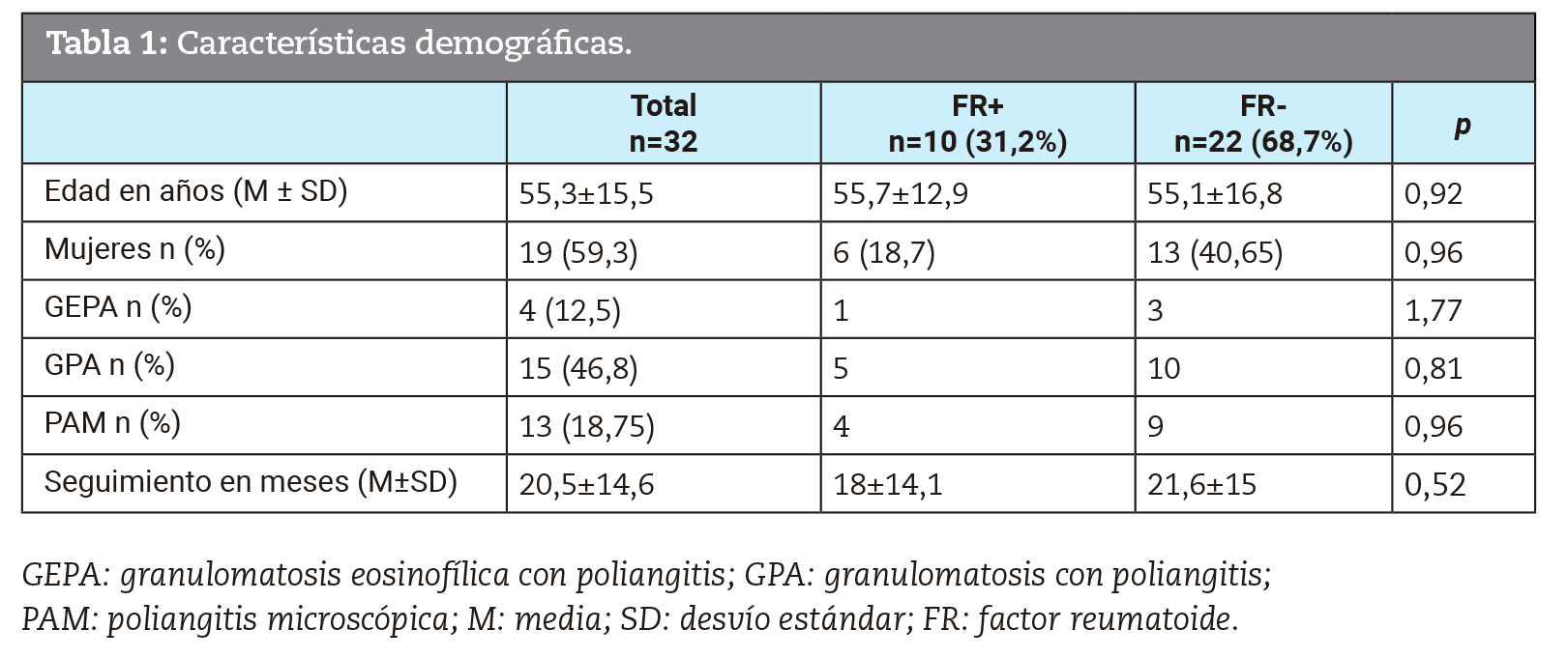 De 45 pacientes atendidos en el período mencionado, se les solicitó factor reumatoide a 32 en los que encontramos 31,2% de FR positivo. La edad media de la población fue de 55,3±15,5 años (59,3% mujer). La mayoría (n=15) cumplía criterios para granulomatosis con poliangitis (GPA), 13 pacientes para poliangitis microscópica (PAM) y cuatro granulomatosis eosinofílica con poliangitis (GEPA). La media de seguimiento fue de 20,5±14,6 meses. Las características demográficas se detallan en la Tabla 1.