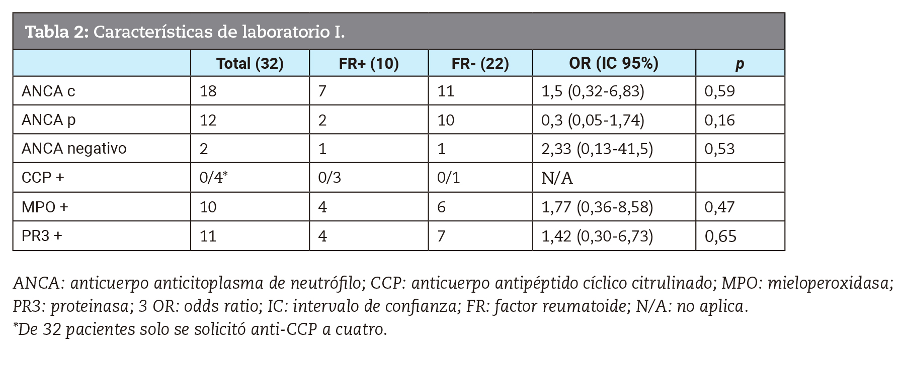 Results: we included 32 patients in whom we found 31.2% positive RF. Compared to those with negative RF, there were no significant differences with respect to clinical manifestations, nor disease activity measured by BVAS and acute phase reactants. The presence of the rheumatoid factor was associated with lower admission to dialysis (OR 0.14 CI 0.02-0.8 p=0.02) and mortality (p=0.04). There were no significant differences with respect to FFS.