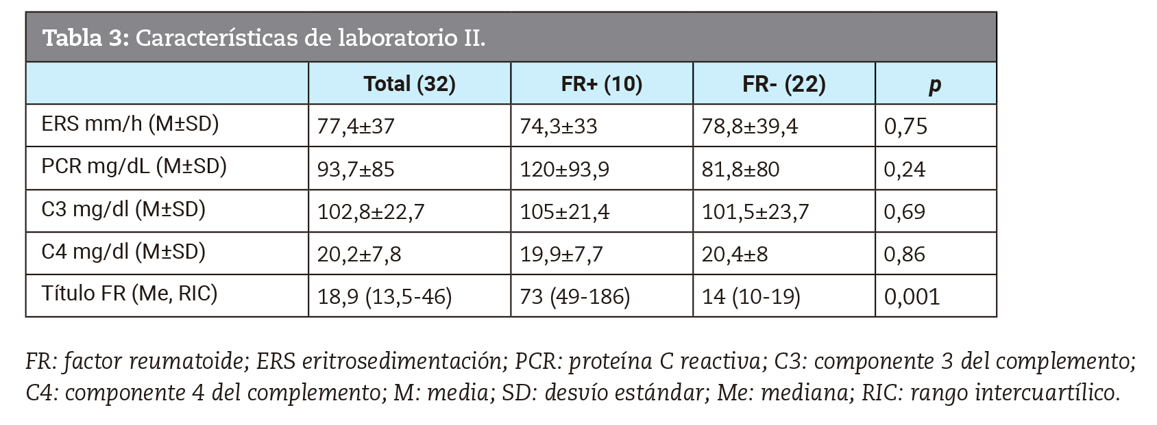 El anti-CCP se solicitó solo en cuatro pacientes y fue negativo. La media de eritrosedimentación fue de 77,4±37 mm/h, sin diferencias significativas en ambos grupos, y de PCR 93,7±85 mg/L, con una media mayor en el grupo FR positivo (120±93,9 mg/L) pero sin resultados estadísticamente significativos (p=0,24). Las características clínicas y de laboratorio se especifican en las Tablas 2, 3 y 4.