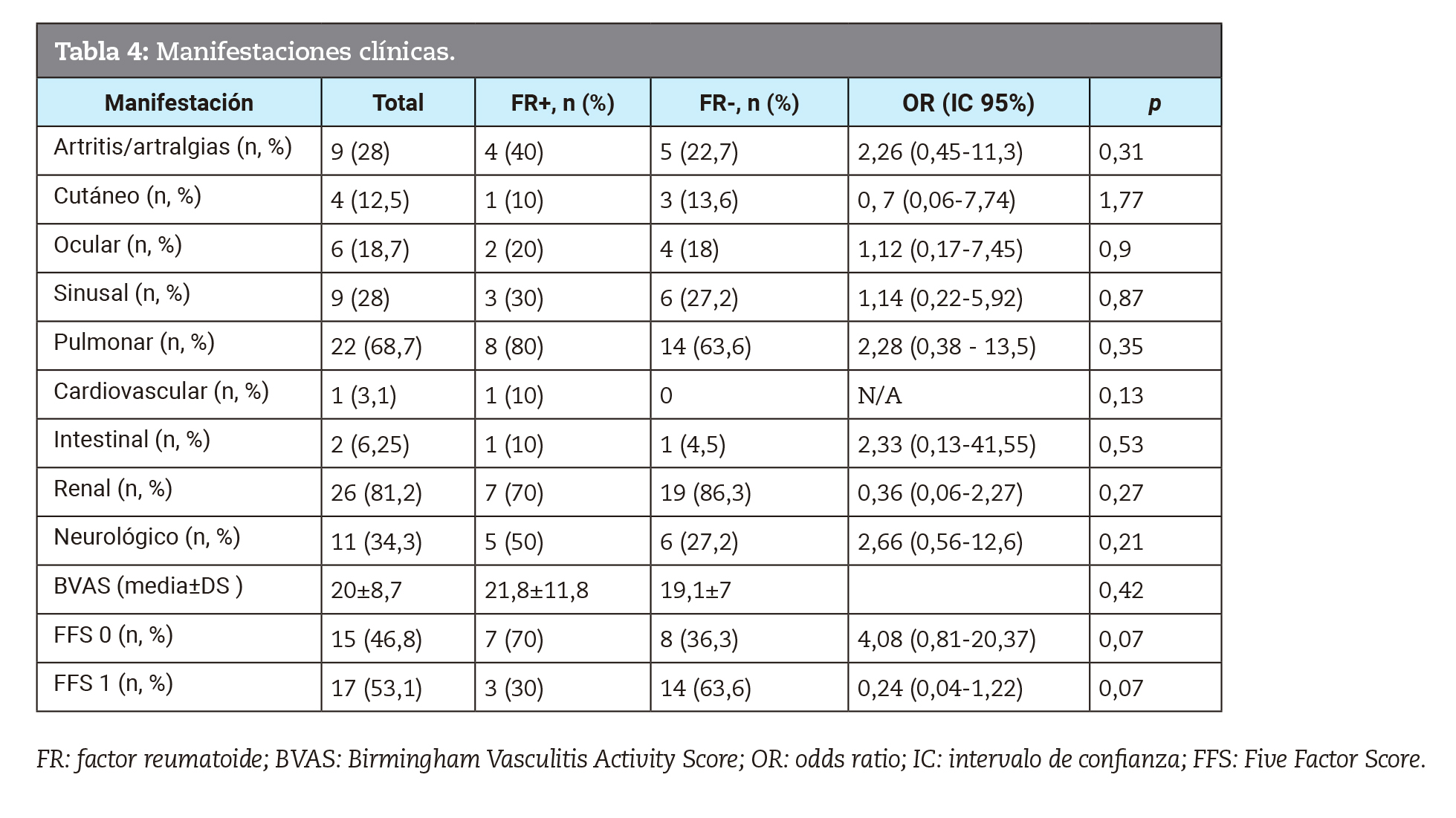 Materials and methods: a restrospective observational study was carried out. Patients with a diagnosis of AVV (GPA, MAP and AGEP) over 18 years of age with RF requested before the start of treatment were evaluated. The following data were collected: age, sex, type of AAV, disease duration, treatment, affected organs, Birmingham Vasculitis Activity Score (BVAS), Five Factor Score (FFS), erythrocyte sedimentation rate, C-reactive protein, dialysis requirement, attendance mechanical ventilation, mortality and cause of death. The odds ratio (OR) and its 95% confidence interval (95% CI) were calculated to determine the strength of association between variables.