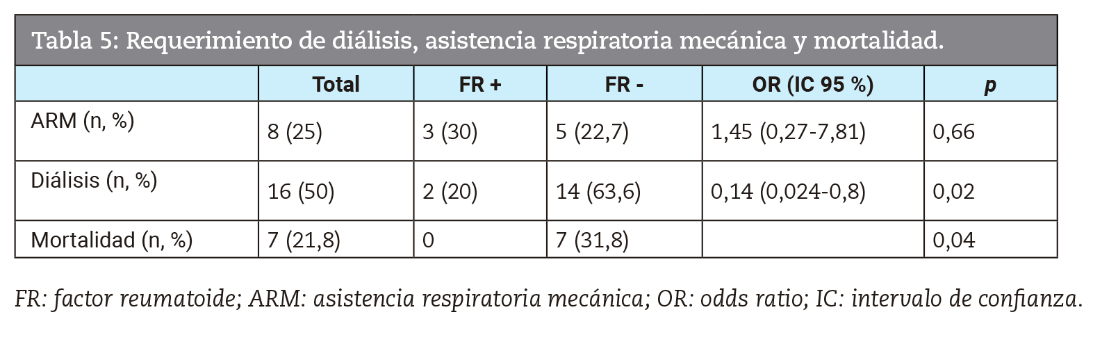 Con respecto a los desenlaces, se observó menor asociación con ingreso a diálisis permanente y mortalidad en el grupo FR positivo (Tabla 5). Las causas de muerte fueron sepsis (n=3) y complicación de vasculitis (n=4).