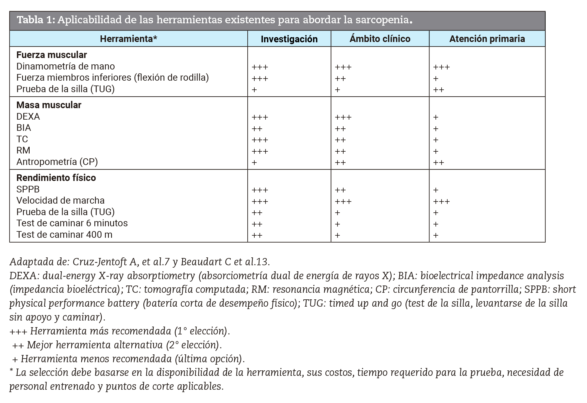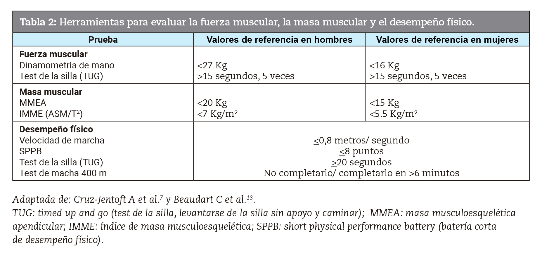 SARC- F: cuestionario de tamizaje para detección de adultos mayores en riesgo de sarcopenia; DEXA: dual-energy X-rayabsorptiometry (absorciometría dual de energía de rayos X); BIA: bioelectrical impedance analysis (impedancia bioeléctrica);TC: tomografía computada; RM: resonancia magnética; SPPB: short physical performance battery (batería corta de desempeñofísico); TUG: timed up and go (test de la silla, levantarse de la silla sin apoyo y caminar).