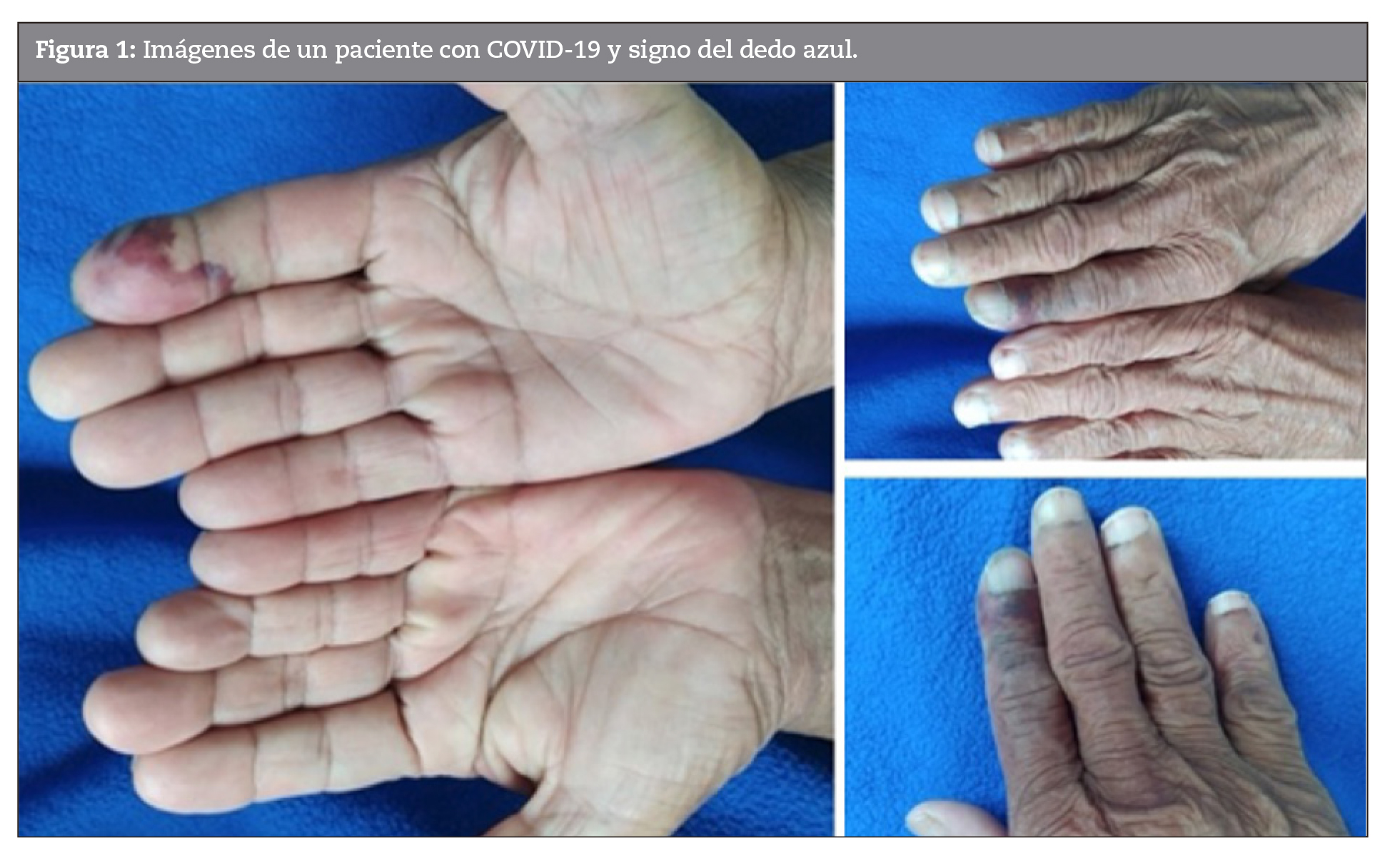 Varias son las manifestaciones clínicas derivadas de la infección por SARS-CoV-2, y se describe esta entidad como causante a su vez de diferentes trastornos vasculares cutáneos, como livedo racemosa y púrpura retiforme, perniosis, isquemia digital y gangrena, incluso en ausencia de algún tratamiento vasopresor, siendo todo resultado de fenómenos de disfunción microvascular y eventos microtrombóticos inducidos por la infección viral35. En la Figura 1 se observa un paciente con COVID-19 que se presentó con signo del dedo azul al Servicio de Urgencias.