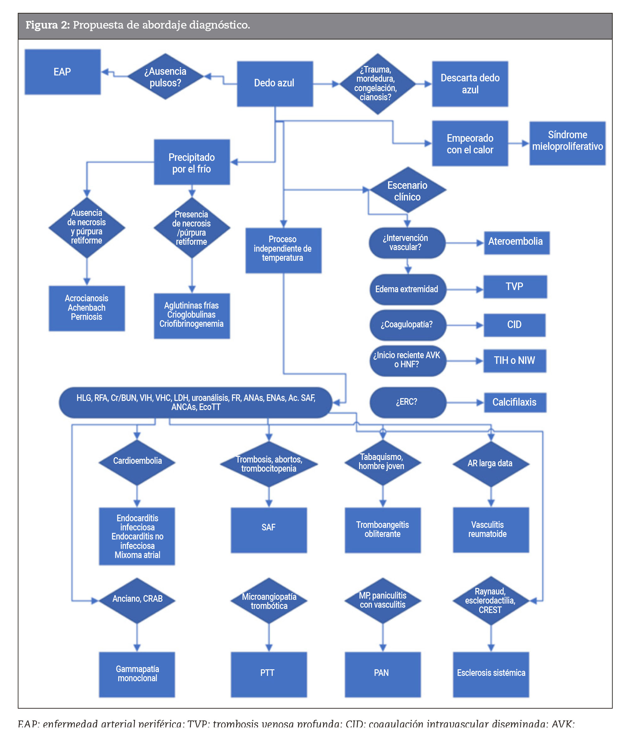Resumen: El signo del dedo azul (SDA) es una condición poco frecuente causada principalmente por la oclusión de la vasculature periférica. Clínicamente puede manifestarse como una coloración azulada o eritrocianótica en uno o varios dedos en ausencia de traumatismo y condiciones propias de congelación. Las etiologías son multiples e incluyen obstrucción del flujo arterial, disminución del flujo venoso y alteración en la viscosidad sanguínea. La importancia de reconocer el signo como motive de consulta radica en encaminar un diagnóstico temprano e instaurar un tratamiento que evite la evolución natural de la enfermedad hacia la necrosis, amputación o muerte del paciente. Proponemos un algoritmo diagnóstico para reconocer los elementos de la historia clínica que guíen la etiología y los paraclínicos disponibles desde el Servicio de Urgencias.