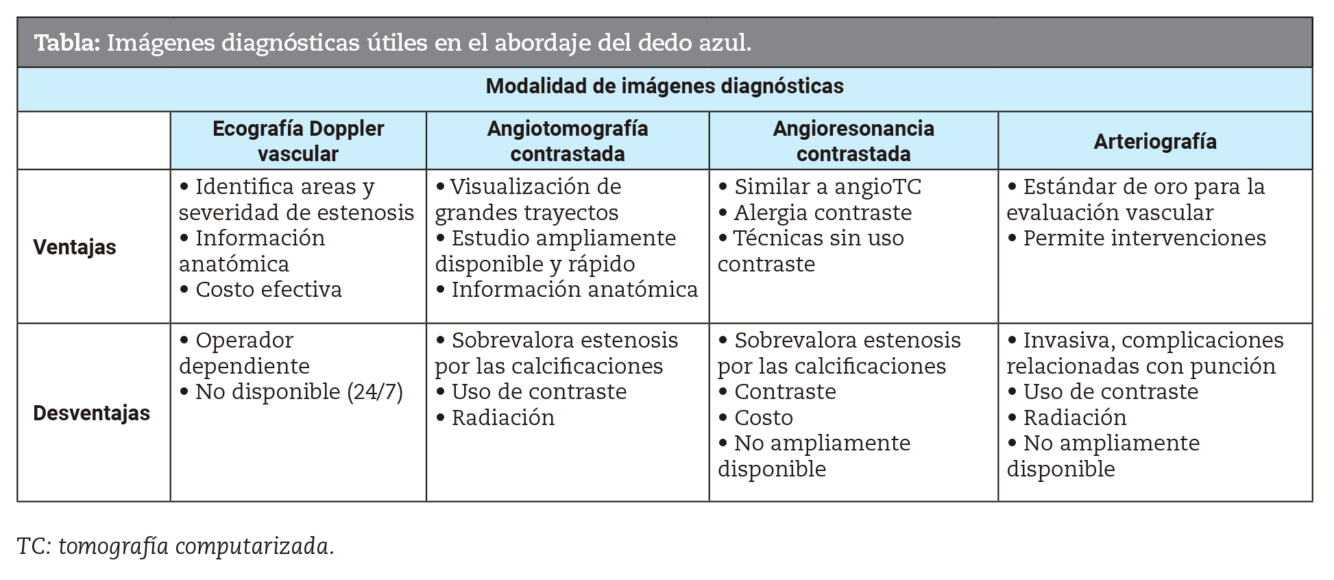 Al momento de evaluar a un paciente que se presente con dedo azul, el abordaje puede resultar abrumador por la multitud de diagnósticos diferenciales mencionados anteriormente, por lo cual debe ser sistemático, teniendo en cuenta que a partir de un signo/síntoma poco frecuente se pueden tener elementos o pistas sutiles que hagan pensar en diagnósticos etiológicos comunes. Esto último se desprende en primer término, de una anamnesis exhaustiva (realizando una historia clínica completa) y un examen físico minucioso. En base a las imágenes diagnósticas ampliamente disponibles, será pertinente realizar aquellas orientadas a descartar patologías agudas5,63,64. En la Tabla se detallan los aspectos a favor o en contra de las modalidades más comunes63,64. Nuevamente hacemos hincapié en que el compromiso vascular tiende a ser de predominio distal o microvascular, por lo cual la mayoría de las imágenes se espera sean normales, siendo subóptimas para descartar el proceso patológico en su totalidad. En la Figura 2, proponemos un abordaje diagnóstico.