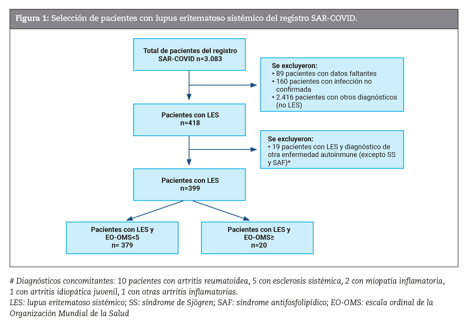 Resultados: se incluyeron 399 pacientes, el 93% de sexo femenino, con una edad media de 40,9 años (DE 12,2). El 39,6% tenía al menos una comorbilidad. Al momento de la infección, el 54,9% recibía glucocorticoides, el 30,8% inmunosupresores y el 3,3% agentes biológicos. La infección por SARS-CoV-2 fue leve en la mayoría de los casos, mientras que un 4,6% tuvo curso severo y/o falleció. Estos últimos presentaban comorbilidades, usaban glucocorticoides y tenían síndrome antifosfolipídico (SAF) con mayor frecuencia y mayor actividad de la enfermedad al momento de la infección. En el análisis multivariado, la hipertensión arterial, el diagnóstico de SAF y el uso de glucocorticoides se asociaron a hospitalización severa y/o muerte por COVID-19 (EO-OMS ≥5).
