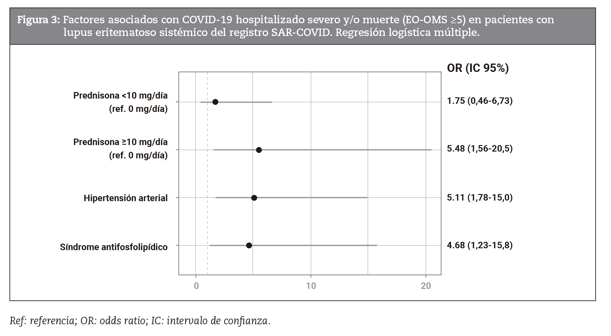En el análisis multivariado, ajustado para edad, sexo, etnia, nivel socioeconómico, educación, cobertura de salud, comorbilidades, enfermedades autoinmunes concomitantes, actividad de la enfermedad y drogas antirreumáticas al momento de la infección, la hipertensión arterial, el diagnóstico de SAF y el uso de glucocorticoides se asociaron a hospitalización severa y/o muerte por COVID-19 (EO-OMS ≥5) (Figura 3).