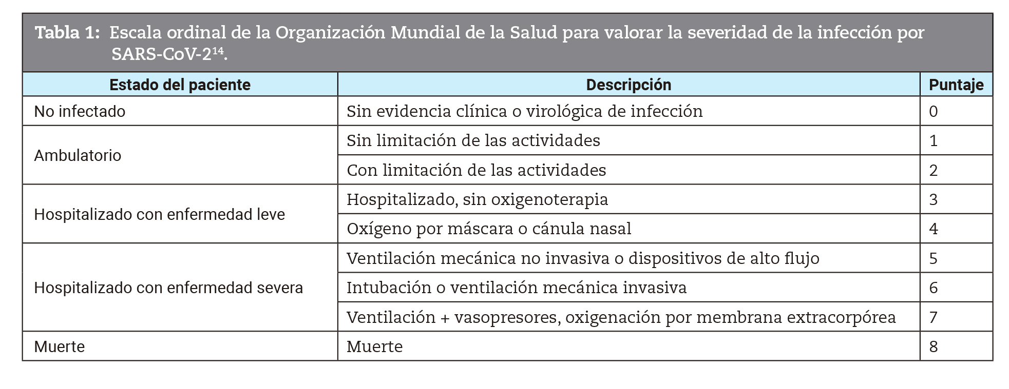 Para establecer la severidad de la infección por SARS-CoV-2 se utilizó la escala ordinal de la Organización Mundial de la Salud (EO-OMS) (Tabla 1)14. Se empleó el punto de corte ≥5 (hospitalización severa y/o muerte por COVID-19) como desenlace primario.