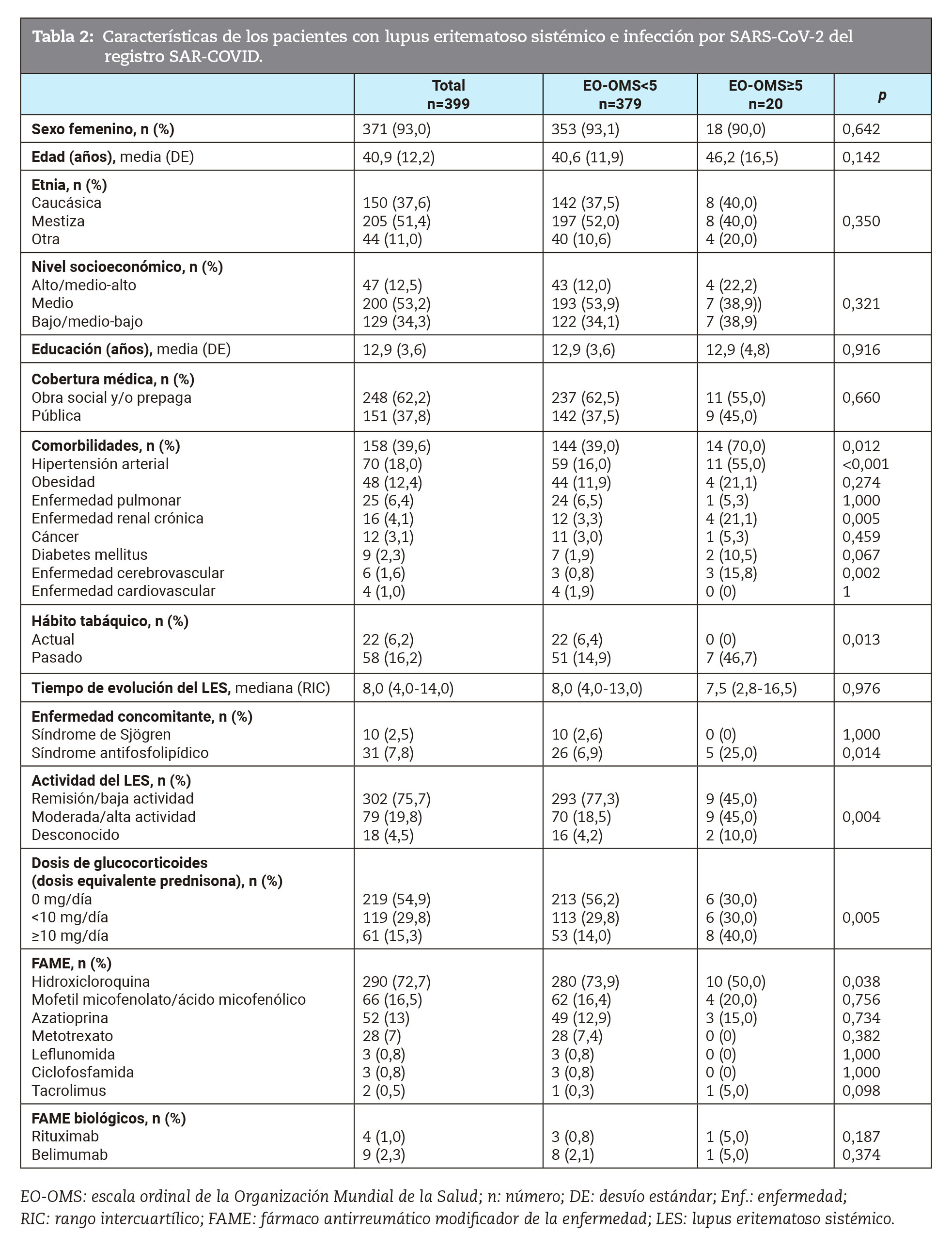 Se incluyeron 399 pacientes, el 93% de sexo femenino, con una edad media de 40,9 años (DE 12,2). La mitad era de etnia mestiza y la mayoría tenía cobertura de salud (obra social y/o prepaga). El 39,6% presentaba al menos una comorbilidad y fueron la hipertensión arterial y la obesidad las más frecuentes. Al momento de la infección, el 45,1% recibía glucocorticoides, el 72,7% hidroxicloroquina, el 30,8% inmunosupresores, incluyendo el 16,5% mofetil micofenolato/ácido micofenólico y el 13% azatioprina. Solo cuatro pacientes usaban rituximab y nueve belimumab (Tabla 2).