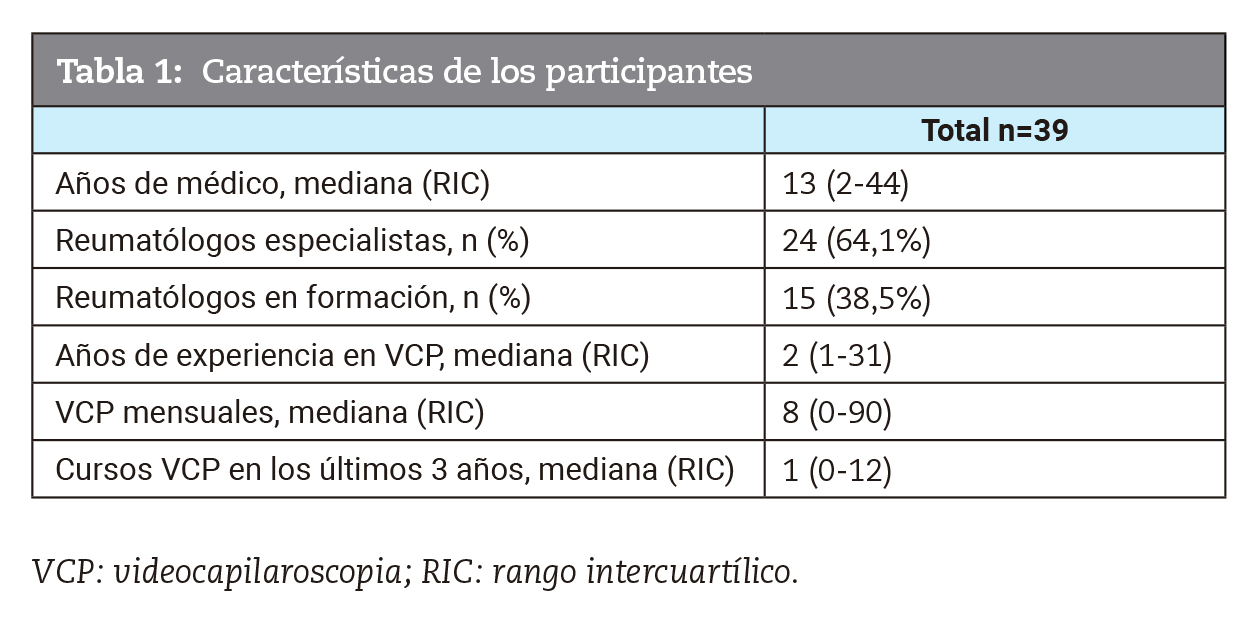 La mediana de tiempo desde la graduación como médicos fue de 13 años RIC (2-44) entre los profesionales intervinientes. La mediana de tiempo de experiencia en videocapilaroscopia fue de 2 años RIC (1-31) entre los participantes. La mediana del número de capilaroscopias realizadas en un mes habitual de trabajo fue de 8 RIC (0-90). La mediana de cursos de capacitación en capilaroscopia en los últimos tres años fue de 1 RIC (0-12) curso.