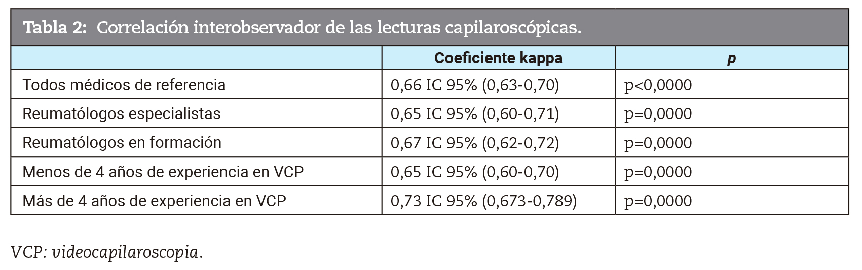 Resultados: se encontró un alto nivel de concordancia global con un kappa 0,66 IC 95% (0,63-0,70) p<0,0000. También en otros grupos como reumatólogos en formación: kappa 0,65 IC 95% (0,60-0,71) p=0,0000, y médicos reumatólogos: kappa 0,67 IC 95% (0,62-0,72) p=0,0000.