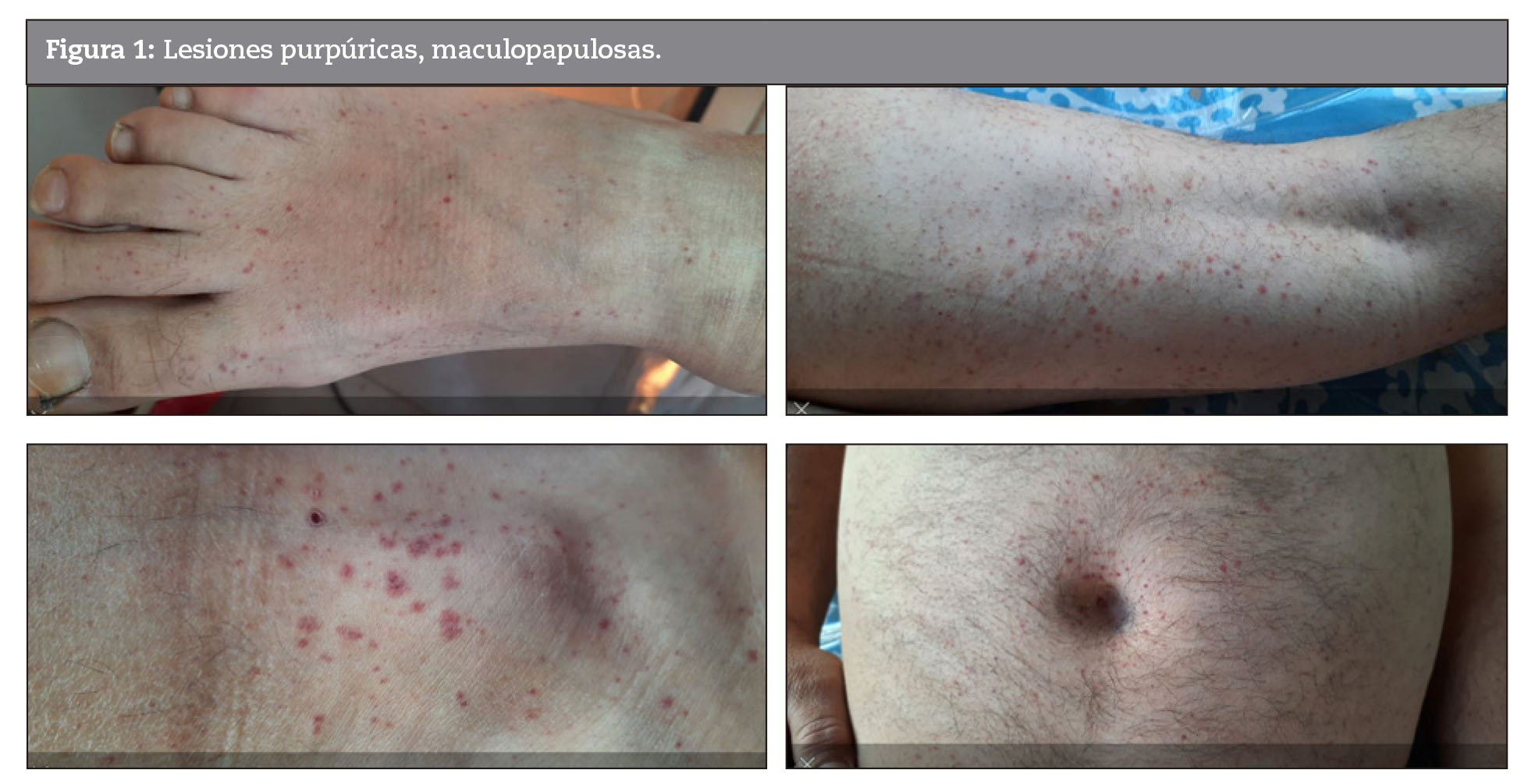 Examen físico: lesiones purpúricas, maculopapulosas (palpables) en abdomen, cara interna de brazos y miembros inferiores, con predominio periumbilical, glúteos y dorso de pies (Figura 1). Resto del examen físico, sin particularidades.