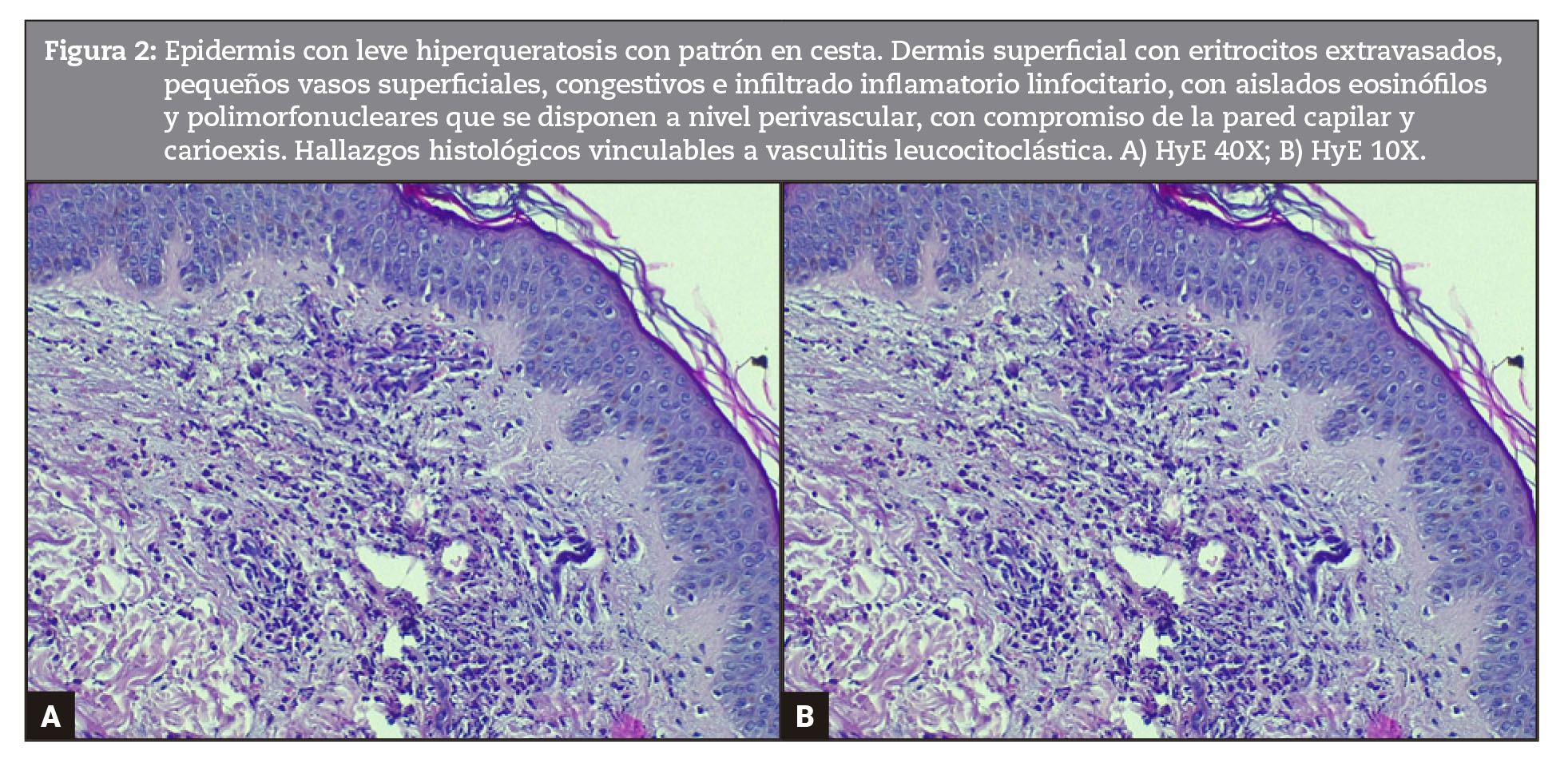 Laboratorio: hemograma, plaquetas, función renal, hepatograma y sedimento orina, normales. FAN (-), ANCA P y C (-), MPO y PR3 (-), crioglobulinas (-), C3 y C4 normal, VIH (-), VHC (-), VHB AgS (-), hisopado PCR SARS-CoV-2 (-). Se descarta infección activa y compromiso sistémico. La biopsia de piel informa vasculitis leucocitoclástica (Figura 2). Comienza tratamiento con meprednisona 8 mg vía oral con resolución del cuadro, buena evolución y sin recaídas en los 6 meses posteriores.