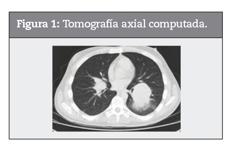 Durante la evolución en la internación el paciente permanece febril con episodios de hemoptisis franca por lo que se considera, junto con el Servicio de Cirugía Torácica, lobectomía inferior izquierda por encontrar aneurismas de mayor tamaño, volumen y alteración parenquimatosa adyacente caracterizada por áreas de consolidación alveolar satélites y aumento de la circulación de arterias bronquiales y colaterales en tomografía de control, pero al ceder la hemorragia, se decide conducta expectante y se descarta tratamiento endovascular dado el tamaño de los aneurismas.