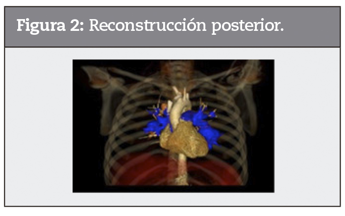 Inicialmente se evalúan etiologías infecciosas con baciloscopia y GeneXpert de esputo, hemocultivos. Por evidenciarse en radiografía de tórax lesiones hiperdensas radiopacas bilaterales, se realiza tomografía axial computada (Figura 1) y reconstrucción posterior (Figura 2) para mejorar la caracterización que muestra lesiones informadas como compatibles con aneurismas micóticos, múltiples dilataciones aneurismáticas bilaterales en ramas de la arteria pulmonar (la de mayor tamaño en segmento apical del lóbulo inferior izquierdo, 77 mm diámetro máximo) y con defecto de relleno mural compatible con signos de trombosis en vena mesentérica compatible con trombosis crónica. Al mismo tiempo, se realiza ecocardiograma que descarta endocarditis e hipertensión pulmonar.