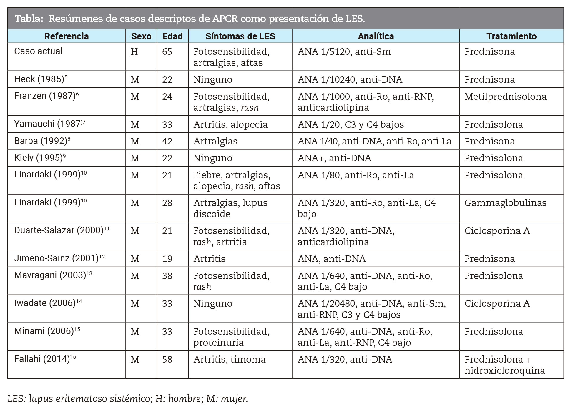 Hasta el momento la revisión de la literatura describe únicamente 13 casos en los que la APCR se diagnostica como debut o previo al inicio de los demás síntomas de LES (Tabla)5-16. Todos corresponden a mujeres, con una edad media de 30 años, siendo el caso actual el primero descripto de un varón, y además de edad avanzada (65 años).