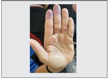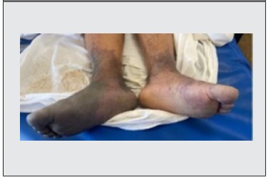 Consultó por cuadro clínico de 3 meses de evolución consistente en una lesión ulcerada en la región maleolar externa del pie derecho, asociada a edema, dolor y cianosis, agregando en los 15 días previos a la consulta, cianosis de los dedos del pie contralateral y en los dedos de ambas manos (Figura 1, Figura 2, Figura 3 y Figura 4).