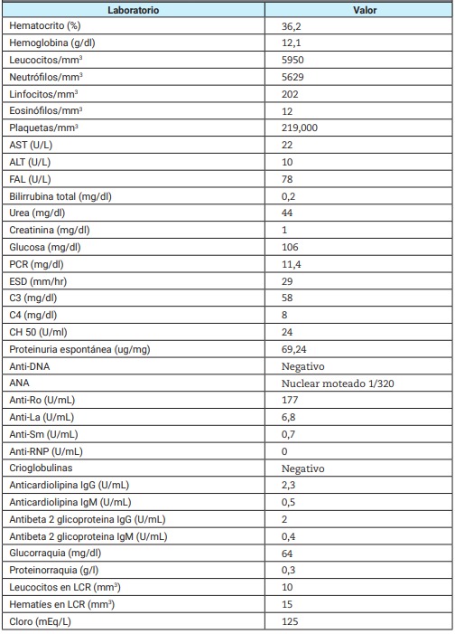 Se realizaron las siguientes determinaciones: PCR SARS-CoV-2, urocultivo y hemocultivos que resultaron negativos. También se efectuó una punción lumbar que informó líquido cefalorraquídeo (LCR) con proteínas 0,5 g/l, leucocitos 78/campo (95% PMN), hematíes 0/campo, glucorraquia 64 mg/dl (glucemia 106 mg/dl). El cultivo de LCR fue negativo para gérmenes comunes, hongos y micobacterias. Los hallazgos del laboratorio se detallan en la Tabla 1.