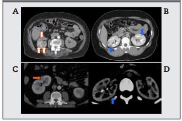 Otra característica en pacientes con insuficiencia renal grave, que fue una contraindicación para la administración del medio de contraste, es el aumento del tamaño renal bilateral. La superficie intraluminal del tracto urinario suele ser lisa. Se pueden encontrar masas retroperitoneales con hidronefrosis uni o bilateral en pacientes con FRP relacionado con IgG4. Las lesiones solitarias no son muy comunes, pero si se encuentran, hay que considerar el diagnóstico diferencial con un tumor maligno. Si el riesgo de malignidad es alto, a menudo lleva a la nefrectomía3.