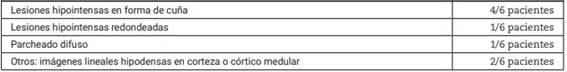 Todos nuestros pacientes tuvieron TC con contraste y lo observado con mayor frecuencia fue la lesión hipodensa en forma de cuña coincidiendo con lo descripto por Takahashi et al; también se detectaron imágenes hipodensas lineales corticales y corticomedulares sin poder explicar este último hallazgo. En 2 (33%) se detectaron lesiones renales de forma incidental, siendo las mismas descriptas en un 35 y 53%2,15.
