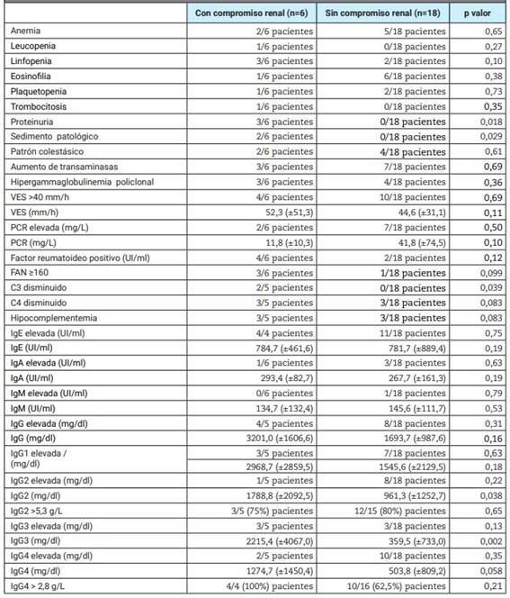 Cuando comparamos los pacientes con y sin lesión renal solo se observó una diferencia estadísticamente significativa en el aumento sérico de IgG2, IgG3, C3 bajo, y una tendencia hacia la significancia estadística en el valor aumentado de IgG4 sérica, FAN positivo e hipocomplementemia en los pacientes con compromiso renal.