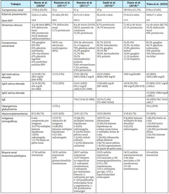 La Tabla 3 muestra la comparación entre las distintas series publicadas de ER-IgG4 con compromiso renal.