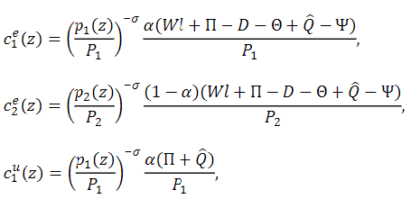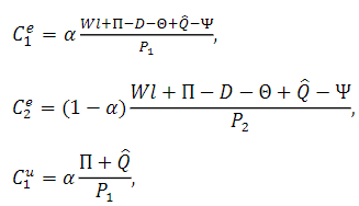 From the first order conditions and the budget constraints for employed and unemployed consumers we obtain the following demand functions for consumption baskets.