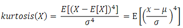 The fourth statistical moment is kurtosis. Kurtosis, being a unit -free statistical measure, can be defined similarly as skewness, except that for the estimation of kurtosis the fourth power of standardized deviation is raised. The positive power indicates that kurtosis is sensitive to positive as well as negative fluctuations of a financial instrument. A random variable, which is normally distributed, has skewness of zero and kurtosis equal to three (Hudson & Mandelbrot, 2010). Kurtosis is defined as: