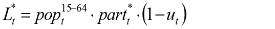 In line with the most empirical studies, we will employ constant returns to scale, just as in the original Solow model. According to (Michaelides & Millos, 2009), the labour content of the Russian economy has been stable, oscillating around 50%, we thus set both alfa and beta constant at 0.5. For the capital stock, we use the perpetual inventory method (PIM), which suggests that the current capital stock is the sum of the past capital stock adjusted for depreciation and present real fixed investments. We set the annual depreciation rate to 0.05, in line with several theoretical studies, e.g. (Mourre, 2009). To estimate the potential labour component, we use the convenient decomposition of headcount figures into working age population, trend participation rate and the ‘trend’ unemployment rate that should in theory mirror the non-accelerating inflation rate of unemployment (NAIRU).